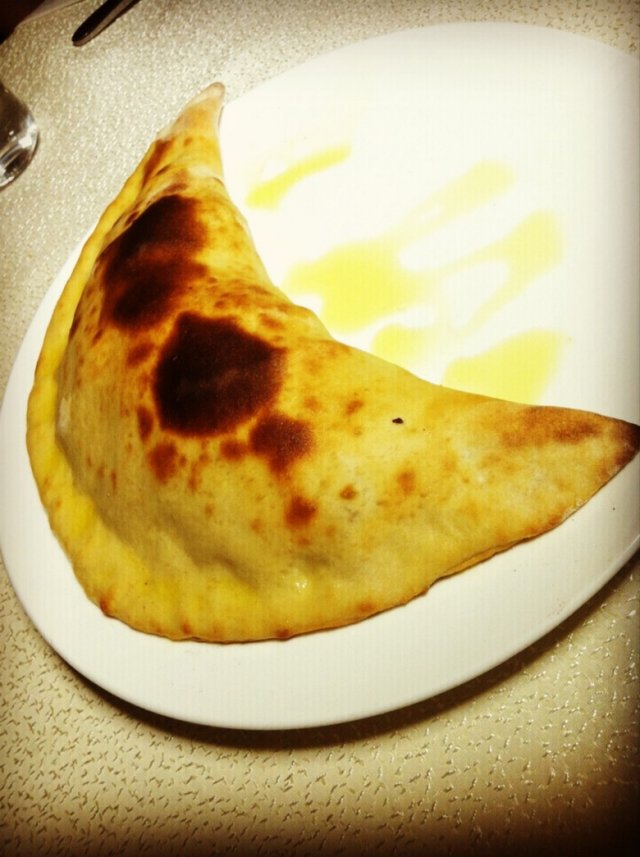 独特的“饺子型”状态呈现于众人眼前,从中间直切,随着热气的飘扬,诱人的香气扑鼻,紧接着是丰腴的馅料汩汩而出,快速切成几份,依稀辨别,配有茄子、水牛芝士、那不勒斯辣味salami、樱桃番茄和罗勒等,浓郁多味,感觉比较多样化~~