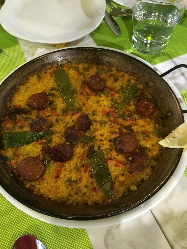 香肠鸡肉饭的色泽比较金黄,香气四溢,饭中有香肠和鸡肉,相对起墨鱼汁海鲜饭这个就比较中规中矩。墨鱼汁海鲜饭的色泽是全黑,但是大家对它的兴趣最强。2份饭的都有店内西班牙主厨为我们服务,还好有翻译帮忙解说。东北大米完全吸收了墨鱼汁,吃完基本牙和嘴都是黑的,不过味道确实很不错,饭中还有一些海鲜。