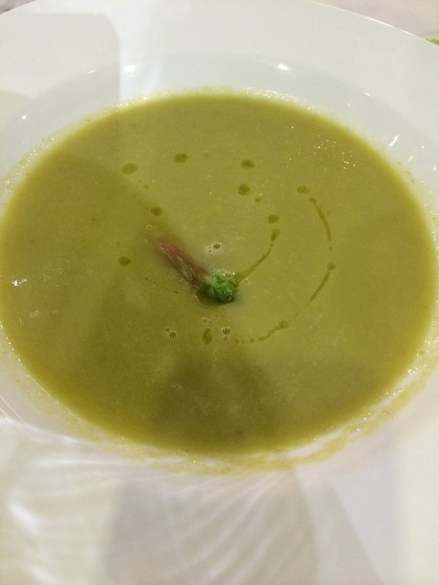 汤的颜色为淡绿色,在汤中有一小节芦笋卷着培根,口感不错,其他朋友有点别的汤,不过貌似芦笋汤的味道最佳。