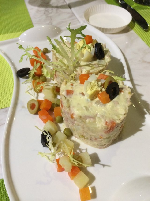 主要是土豆,搭配少量的青豆、橄榄、胡萝卜调配出来的沙拉