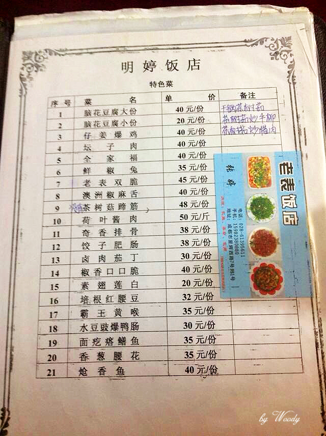成都最牛的苍蝇馆子 woody755等级42013-11-1518 浏览 关注 这是成都最牛的苍蝇馆子。貌似已经改成老表饭店了。 不过只要味道好,巷子再深也能找到。。 以前环境不好,桌椅就靠在简陋的棚屋边,现在改良了很多。 店员态度也不错,很勤奋。 点了萝卜排骨、脑花豆腐、莲白粉丝、水豆豉鸭肠、油爆双脆。份量都超大。 脑花豆腐是招牌菜,点的小份,20元,脑花很好不腥。 朋友说,这十几年味道还是如旧,没变。 油爆双脆,花椒好,味道好,油爆得很香,貌似有兔肚。。吃过忘不了。 最后吃饱喝足想要发票,朋友说,他家做了十几年都没发票。。以上食记乃用户个人意见 , 并不代表OpenRice之观点。赞好分享成都最牛的苍蝇馆子 明婷饭店 https://s.openrice.com/KtLT3G0hba800检举 张贴 评分4味道2环境3服务3卫生3抵食人均消费¥50 (午餐)