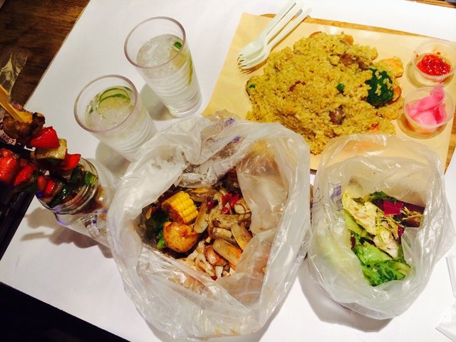 根据大家推荐,点了一份沙拉,一个串烧拼盘,虾贝组合,一份花甲烩份,还有二杯苏打饮料。先上个总图: