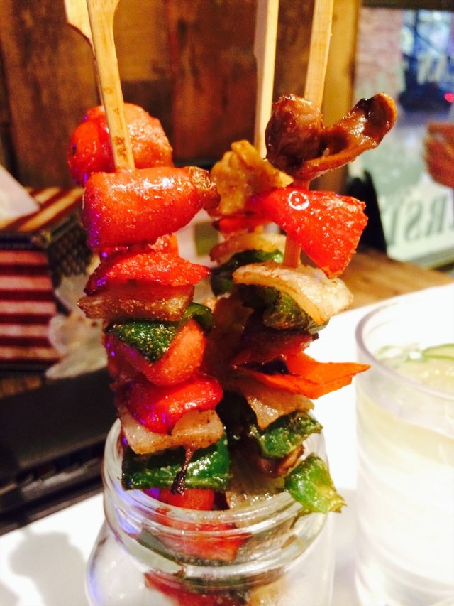 串烧里面有一个是小番茄外面包的一层里脊,吃起来会有一点点酸味,味道很特别。