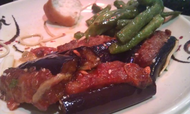 茄子人家还加了肉馅儿 做的那种铁板茄子啥的