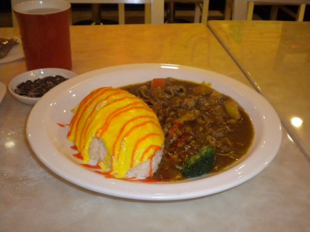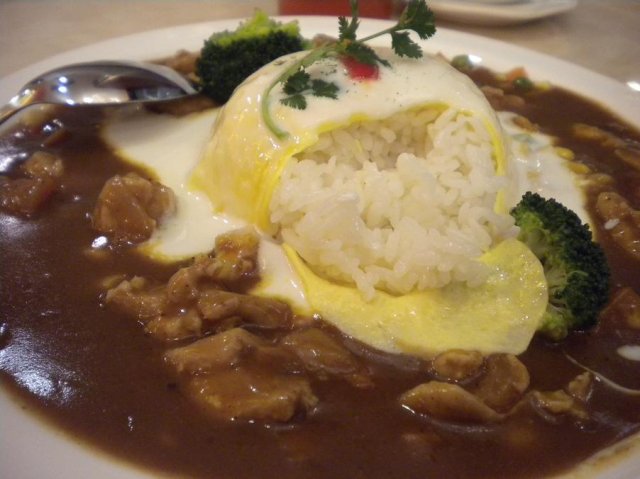 12月18日晚上第二次去~这次是吃的咖喱鸡丁芝士蛋包饭。鸡丁都是大块的鸡块,口感要比一般的鸡丁有韧性些,咖喱味道跟上次是一样的,但因为有了奶昔状的芝士,味道变得富有层次感和柔和多了,挺好吃的呢,就是端上来不像上次是热的,是偏温的,这种天气,当然要吃热的额。