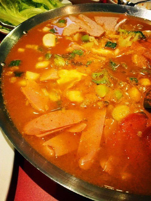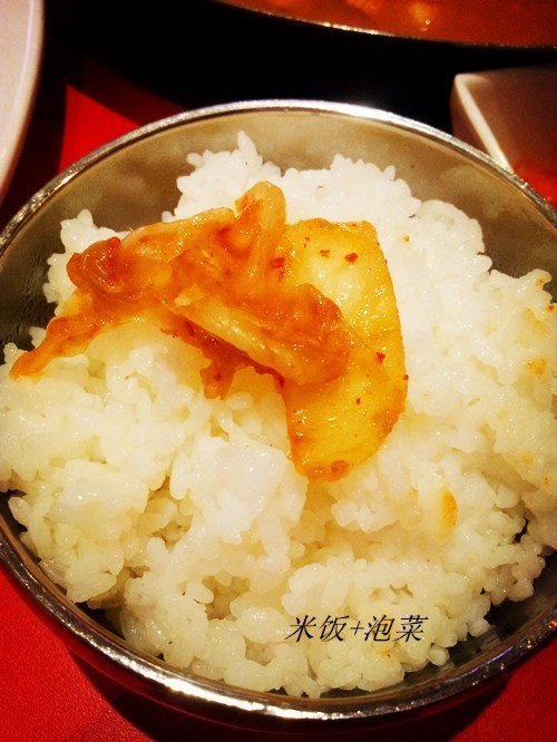 部队锅刚上桌时的摆盘很漂亮,内容很丰富,看着就很诱人,超有食欲,服务员会现场将高汤加入锅中,并帮助拌开,告知等锅开后就可食用,部队锅绝对是越煮越好次,搭配送的米饭,超级赞!