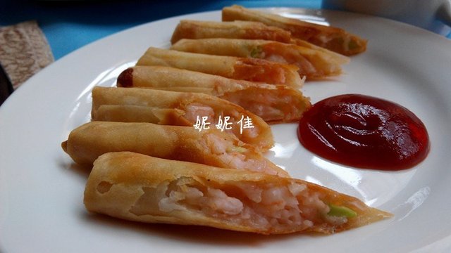 印尼脆虾棒:春卷皮里包着鲜虾,油炸后蘸番茄酱吃,现炸的,很酥脆,看里面虾也足。