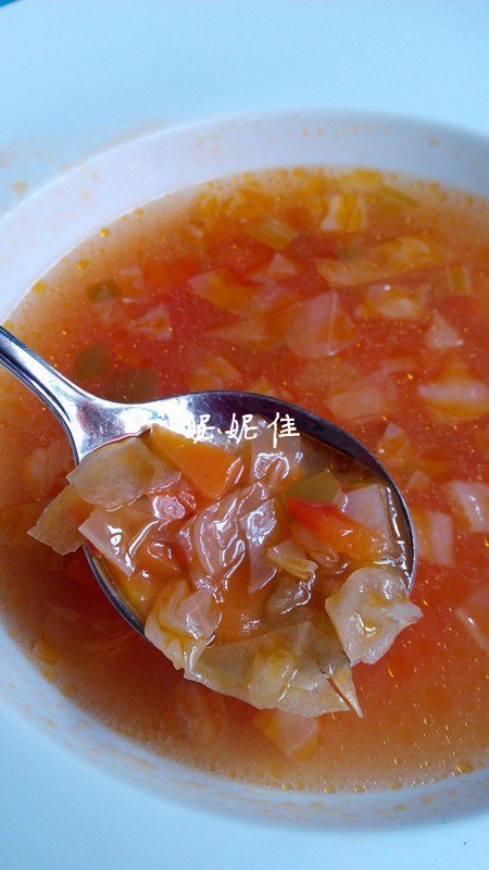 德式蔬菜汤:圆白菜、青红椒、胡萝卜、洋葱做的例汤,不是俄国红菜汤,也不是罗宋汤,味道太淡,就是水里煮的,有点番茄味,有点红色。
