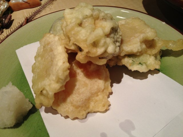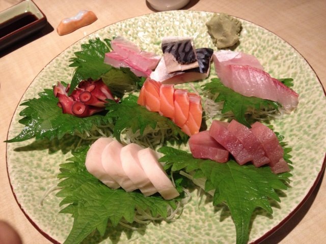 【刺身拼盘】喜欢刺身拼盘的碧色盘子,没有用假的树叶,让人很欣慰,但是这个叶子有点苦,八爪鱼刺身第一次吃到这么赞的,本觉得八爪鱼应该会有点难咬,但口感实在是滑中带嫩,尤其是吸盘那里,有特殊的嚼劲;三文鱼的纹理好清晰啊,自然新鲜得很喽!入口即化的美味肉肉!