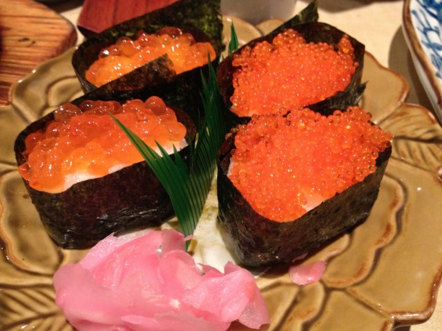 【蟹籽寿司Vs鱼籽寿司】寿司手卷神马滴吃日料肯定要点,比较喜欢的蟹籽寿司果然不出所料的很多蟹籽,各个击破的感觉真好,咯吱咯吱的声音让米饭都跟着好吃起来!