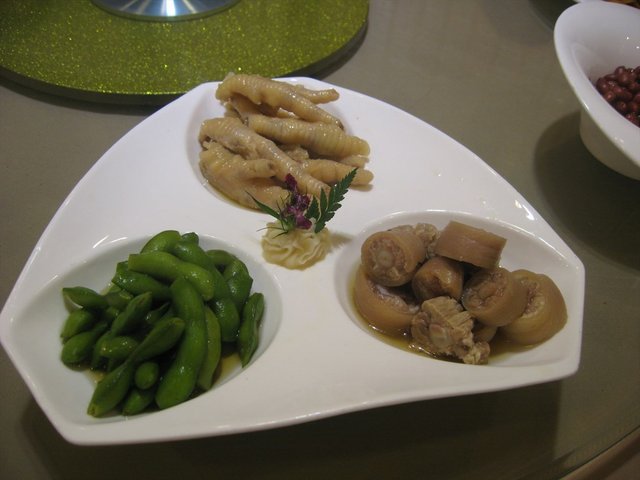 冷菜:酱萝卜,很脆爽,夏天吃很舒服。麻酱凤尾,麻酱的味道很香,油麦菜很清爽。糟三样,里面有毛豆、猪尾和凤爪,猪尾我不吃,毛豆不够苏,凤爪很不错,糟卤很鲜,很入味。紫薯,做成一朵朵的放在黄瓜片上,造型挺漂亮,紫薯泥打得很细腻,也不会很甜,不错。