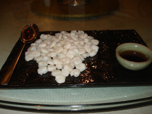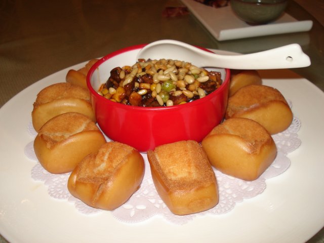 刀切鳝鱼米,78元,一碗由鳝鱼粒、松仁、香菇粒等炒成的酱料,旁边围了一圈炸过的盗窃馒头,炸过的刀切很香很脆,但是有点油啊,那个鳝鱼炒得很香,不过我觉得有点小咸。