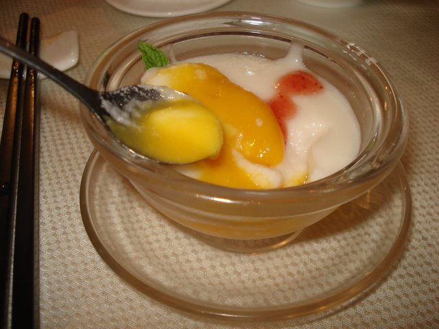 芒果米浆冻,装在透明的小碗里,底下一层,芒果泥,上面一层米浆冻,米浆冻上还用草莓酱做了一小点点缀,外形就很灵哦!芒果泥酸酸的,蛮好吃的,上面的米浆冻很细腻润滑。