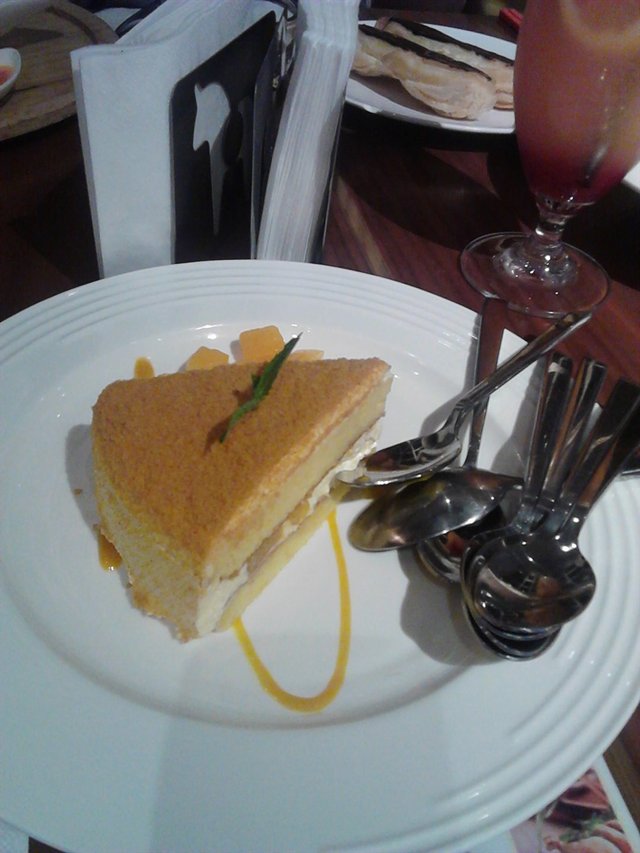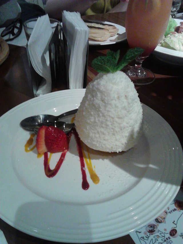 甜品点了新加坡歌剧院蛋糕,这个卖相蛮别致的,外层是沾满椰丝的鲜奶层,里头是一段软糯的香蕉,不会很甜,不肥腻。榴莲冰淇淋,榴莲味还蛮浓的,大爱冰淇淋哦。