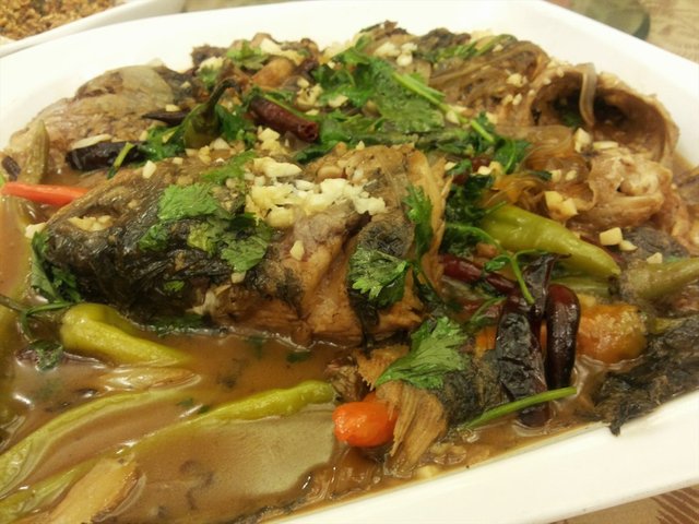 招牌水库炖鱼,招牌菜很大很大个的鱼,鱼肉蘸着汤吃很鲜美。