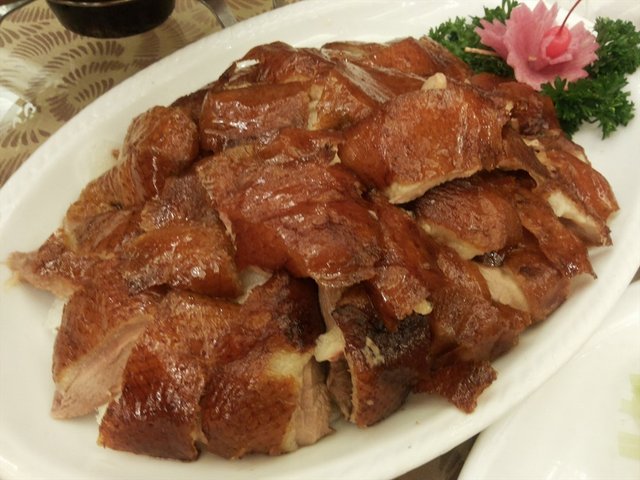 片皮鸭,虽然知道这玩意儿得就着饼吃,但是我平时就是喜欢光吃鸭子肉~于是吃了好几片~油挺大的~没有什么味道,还是得传统的蘸着酱吃~片鸭的下面都是虾片,刚炸出来的时候比较好吃,脆脆的但是没过一会就软了~
