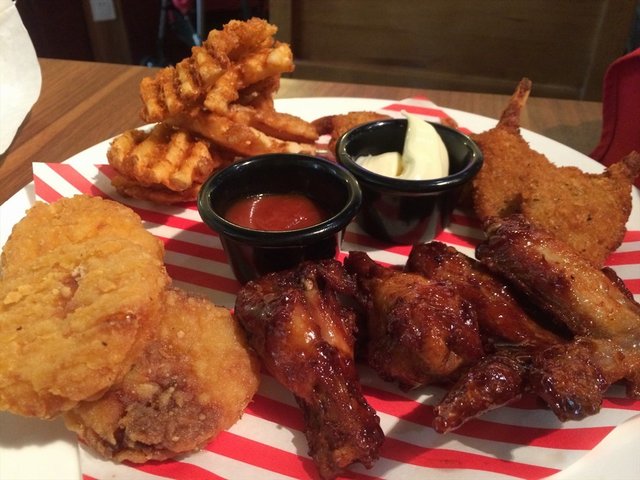 拉亚特色拼盘,79米。之前最爱的鱿鱼米有了,换成了不起眼的玉米饼,不过在各种咸味的小吃里这货居然能脱颖而出也实属不易,软糯却又不甜腻。烤鸡翅BBQ酱料咸鲜口味很赞,鸡肉烤制的够入味,翅根配翅中的整翅搭配看起来更有食欲呢。薯格稍咸,和别家吃起来口感相近。香草凤尾虾有点炸过火了,虾肉比较薄,还是更喜欢PIZZAHUT的炸虾。