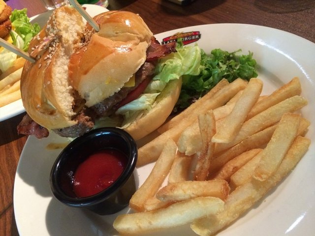 花生酱双层培根牛肉堡,60米。华丽丽的记得以前是79米来着,以为换了菜单,价格也有所下调。花生酱的存在并没有觉得突兀,微甜香浓,反而让汉堡的味道更有层次。牛肉饼够厚实,但多汁的口感打消了之前吃皇堡巨无霸之类的柴肉饼印象。煎制过的培根有点硬,口感不太好。这款绝对是肉食爱好者的最爱咩~