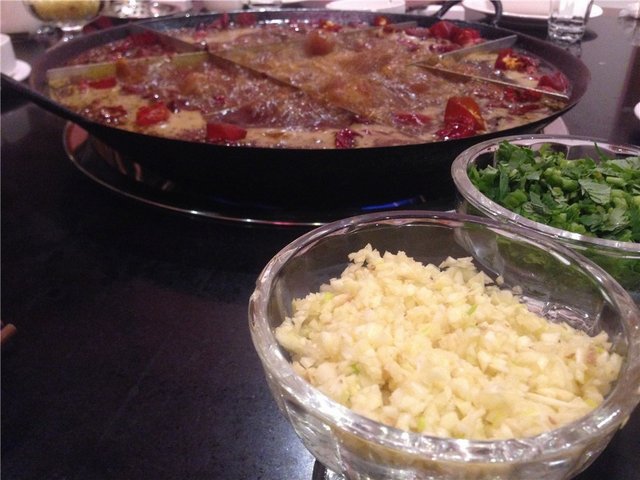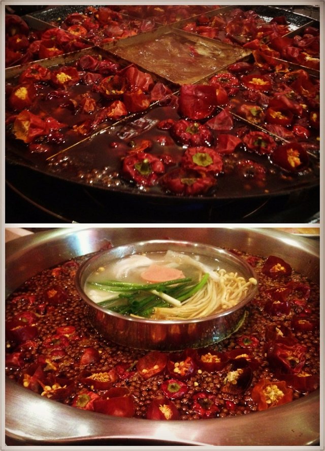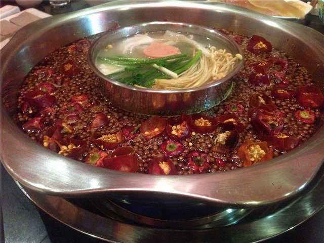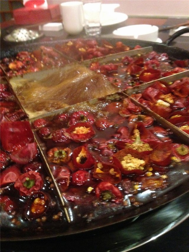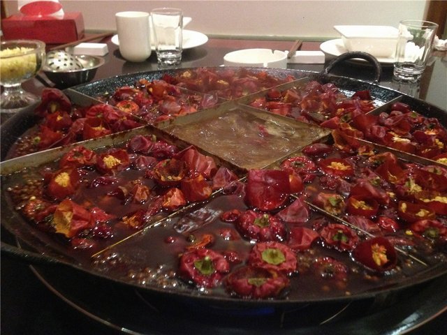 看起来色泽鲜艳,表面飘着辣椒花椒很多,但是吃起来味道适中。很香很浓郁!首先锅底就是相当的赞!