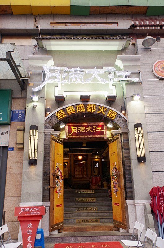 月满大江的门面装潢很有特色,木门,画上了门神图画。LOGO是白色的月满大江四字,不过因为背景也是浅色,所以不是很显眼,为什么不能改成红色字?