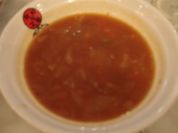 牛肉罗宋汤的口感很浓,吃上去胡椒味道貌似放过很多,有点胡椒的辣辣的口感。这里的牛肉罗宋汤和外面的有很大的区别:吃的出来里面有火腿、胡萝卜、白菜和牛肉还有少许的西芹在里面,很喜欢西芹的味道,西芹脆脆的而且西芹很清香的感觉,配合的牛肉罗宋汤的胡椒辣辣的感觉和西芹清香的感觉让这个牛肉罗宋汤层次丰富了很多,不过就是吃嘴里很干。