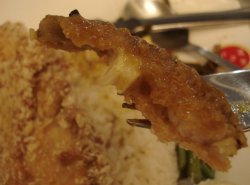另外的一个——干锅烧鸡肉(商务套餐) 看上去就是有点鸡肉和 很多蔬菜 混合的感觉,吃上去比较咸,卤肉味道比较浓一点,而且是用酒精灯烧的,感觉很有特色(貌似火锅的感觉),鸡肉很嫩,而且吃上去汁水都流出来了,不过混合的蔬菜不是很喜欢。吃去来那个青菜和四季豆都是相当的老,嚼老半天才可以吃的进去,而且那个卤蛋和鸡肉干锅根本就不搭,总体来说这道菜没有咖喱鳕鱼排配土豆泥的那个商务套餐要可口,看来点了还是比较失望了。不过那个饭还不错的,芝麻放上去还是很香的,比咖喱鳕鱼排配的饭要香,而且不是同一种米做的。