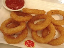 过会,美式葱圈上来了,虽然是油炸的,但是没有感觉的出来时油炸的这种油腻的感觉。反而是旁边的番茄酱很去油腻,把整个原来是面粉一起炸的圈圈调味了不少,酸酸甜甜的很喜欢这种口味。不过怕胖的MM还是少吃吧。