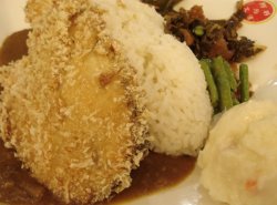主菜上桌了,这次的主菜还是一个以最喜欢的咖喱为主——咖喱鳕鱼排配土豆泥(商务餐),价格32元,虽然价格适中,但是个人感觉是物超所值的。可以看见除了有一大块大大的鳕鱼,还配上丰富的米饭、一点点的开胃小菜(实际上就是四季豇豆和咸菜~)和土豆泥。土豆泥很糯而且土豆的味道很回味,吃起来不是传统的土豆的面粉味道,这里的土豆泥有点甜甜的有点硬硬的感觉。而鳕鱼排的口味比较入口即化,没有刺,鳕鱼很嫩而且吃起来鱼肉的香味味道十足。外面是金黄酥脆的,但是里面是雪白滑嫩的很喜欢。唯一不是很喜欢的就是米饭比较硬,像隔夜饭的感觉,而且鳕鱼有点油油的,右半边有点焦掉的感觉。