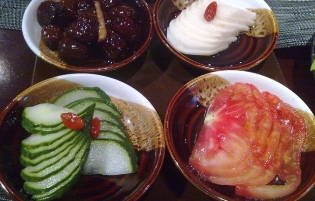 @招牌四个小拼/32块,里面有四种冷盘,每种都只有一点点,本来我还很期待那里面的黄金山药,他居然没有,还不通知一声,就直接用黄瓜代替上了一刚。。。什么意思。。。里面么也就是地瓜,黄瓜,番茄,红枣,没啥特别好吃的。。
