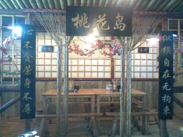 进门一律称侠,大侠女侠一堆堆的,桌子和包房也是模仿金庸小说的,什么桃花岛江南七怪的,我们坐的是明教,虽然很烦张无忌。。。忍了。