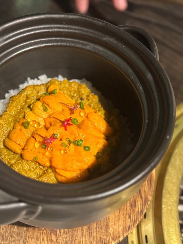 這裏聰明地用海膽配上各種食材、既可令客人相機食先之餘、海膽的鮮甜味亦可提升該道菜的質素。 可惜他的海膽牛肉的牛肉太瘦接近有渣邊緣、雖然並不是每款牛肉都要溶化才為好吃,但個人認為牛肉應該稍為挑選一些較多紋理容易溶化、才可達致與海膽「膽牛交融」 的神奇效果。 另一道海膽蟹粉斧飯不論從影片或相片看都是毫無破綻、他們建議先吃原味、再加上蟹醋一起伴吃兩種食法、但個人認為海膽本身吃的是鮮甜味若然加上蟹醋的酸絕對浪費了海膽的角色、所以我覺得第二個食法是不必要的、再加上他的米飯煮得過濕、若然能夠乾身一些,再加上鍋巴攪拌、我相信會是另一番境界