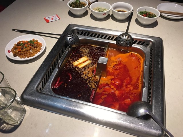 麻辣同蕃茄湯底,麻辣看似好辣,但剛剛開始其實味道不會太過辣,不過隨着時間影響而令到火鍋越來越辣,食得好過癮。