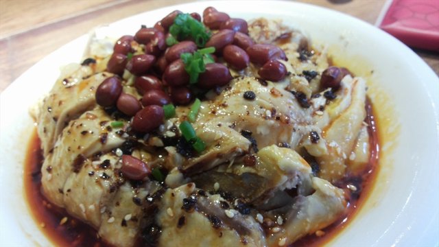口水鸡,感觉有点怪异的做法,上面有撒辣沫,看着高高的,里面都是黄瓜,感觉黄瓜味道不错。上面的花生有点拧掉了