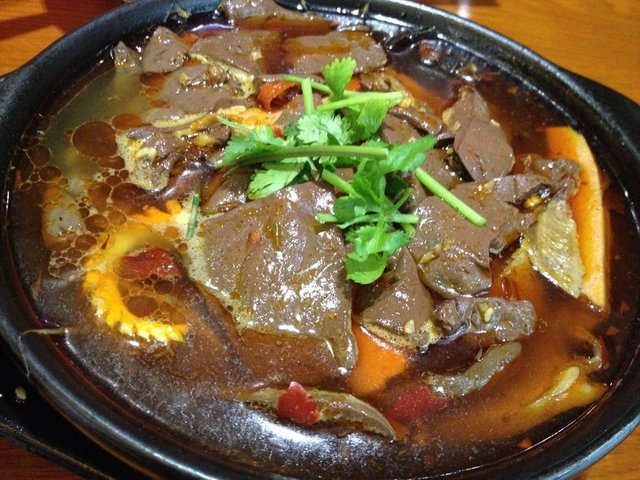 【重庆毛血旺】18米,里面有几片猪心,几片火腿肠,还有两片指甲盖大小的毛肚,最上面铺了一层血旺,下面全部是豆芽,哎,那么多豆芽是因为豆芽成本比较低么?!再说味道,汤底油气不重,麻辣味道够了,血旺很下饭,算是套餐里面比较好吃的一道菜吧。