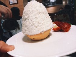 新加坡剧场~甜品~外面一层椰子粉~挖了一勺~有果肉~越到里面越是能看到惊喜~有布丁有香蕉肉~好好吃的
