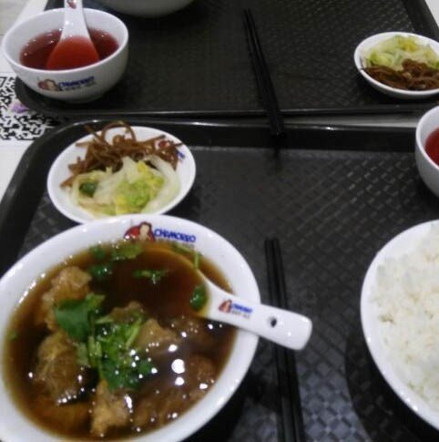 团购的22.3元的双人套餐,鲅鱼五花肉和筋头巴脑,都是套餐,感觉量不是很多,但是够吃的,取餐的时候服务员会问是不是吃香菜,还会提示说汤可以随便加的,套餐虽然一般但是汤味道还是很不错的,很浓郁的,鲅鱼五花肉,里面基本上都是大肥肉,有点腻腻的说,鲅鱼很烂, 烂到让人怀疑那是不是罐头呢~筋头巴脑,里面没有图里那么多的量,没几块肉,但是很烂糊,也不塞牙,还是不错的~