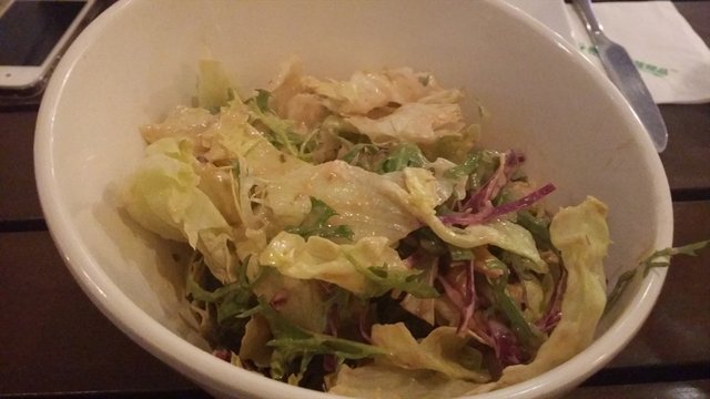蔬菜沙拉跟之前吃的蜜汁煎鸡排配的是一样的,都是生菜还有苦苣之类的,配上沙拉酱,菜挺新鲜,沙拉酱也嗨可以。