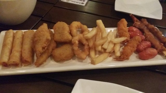 有香肠,薯条,春卷,洋葱圈,鸡块,炸虾。都是炸的东西,感觉面稍微有点多。