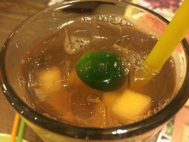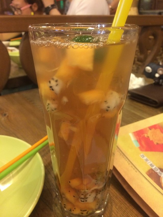 水果冰茶,13米。发现这家的饮品价格都很正常,水果冰茶里是哈密瓜火龙果配柠檬红茶的节奏,茶味道很重,不甜,很清爽的口感。