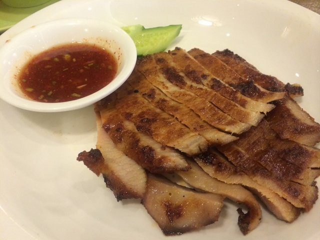 傣族烧猪颈肉,39米。比起亚洲土地烤肉,这款服务生介绍略瘦略咸口,成功的回头菜哈。猪颈肉一向都很鲜嫩,但这款这么厚实的肉片还是博得了小伙伴的青睐,很有爱的搭配蘸料,酸甜可口,肉质紧实滑口,默默点赞。