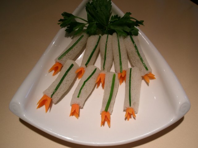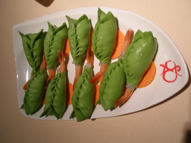 鲜虾凤尾饺 ,碧绿的饺子加上底下胡萝卜的衬托,煞是好看,里面包裹整只的鲜虾,一个怎么够啊!