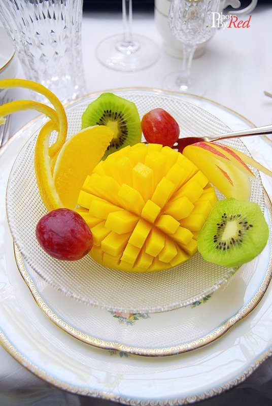 朋友点菜的同时,服务生先端上餐前水果,芒果、猕猴桃、提子、苹果、橙子,按位上的,份量有些惊人。