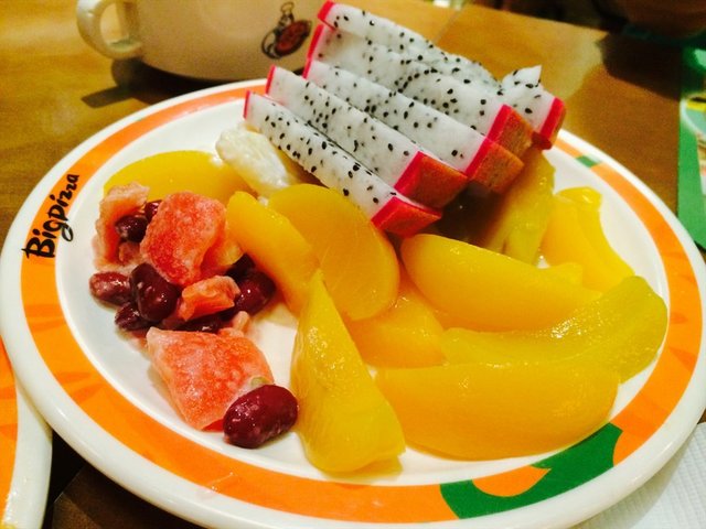 这家店水果比较多,火龙果,哈密瓜,西瓜,普通,圣女果,黄桃,各种水果沙拉。
