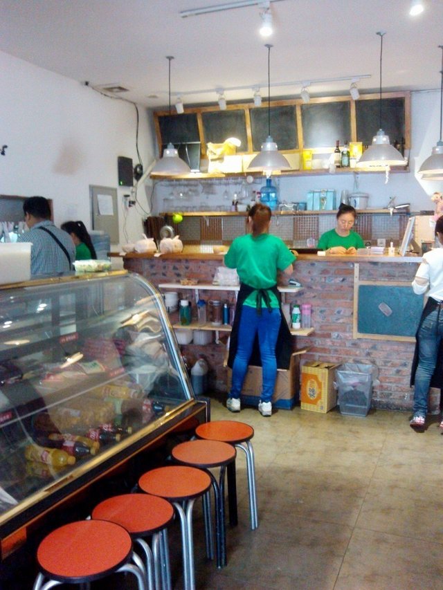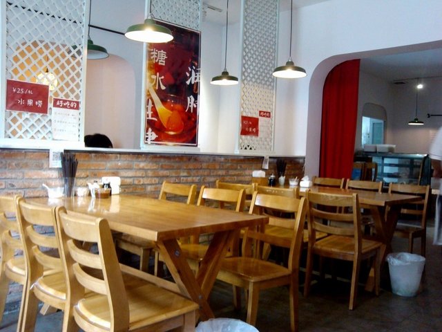 店面不是很小,外面看环境比较一般,里面还可以,砖砌的吧台乍看有些像个咖啡店,里面以木桌椅为主,布置得比较简单,但还挺温馨的。因为离学校近,所以来这里消费的大多是学生,所以人多时经常会有拼桌的情况发生,而且似乎拼桌是很常见,因为服务员在需要拼桌时根本都不询问先来的客人的意见。