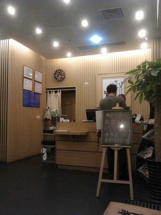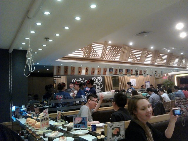 气氛蛮好的 坐在吧台,寿司师傅有很多日本人,有日本师父坐镇果然显得比较专业的样子~师父叫卖声很大,还经常从转台上拿已经转了几轮可能不新鲜了的寿司扔掉。可以点单让师傅自己做,也可以自己拿。因为之前有吃过东西了,所以我们没吃多少,马铃薯寿司很好吃,三文鱼寿司吃了三种,火炙的,主厨推荐的,还有原味的,都非常新鲜,鱼的油脂很丰富,吃进嘴里很滑,非常新鲜的。玉子烧甜甜的,章鱼沙拉里有很大一块章鱼,也不错的。
