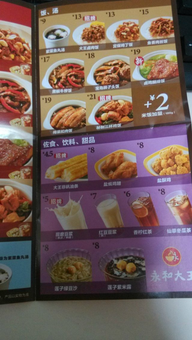 永和大王 尖果儿等级32013-08-1015 views Follow 地址: 朝阳区建国路乙118号京汇大厦1楼 周末出来玩。中午饿了。正好附近有家永和大王 中午饭点人还挺多的。点餐后自己取餐。不太喜欢这样的方式。跟食堂似的。 要了一碗卤肉饭。里面有卤好的肉丁 还有半个鸡蛋 还有白菜。卤肉味道很好。香而不腻。汤汁拌米饭味道不错。 红茶有点淡。可能是加了冰块的原因。 现在推出外卖了。免外送费。不过貌似涨价了。The above review is the personal opinion of a user which does not represent OpenRice's point of view.LikeShare永和大王 永和大王 https://s.openrice.com/KtLT1m0YgO600Report Post Ratings4Taste4Decor4Service4Hygiene4Value