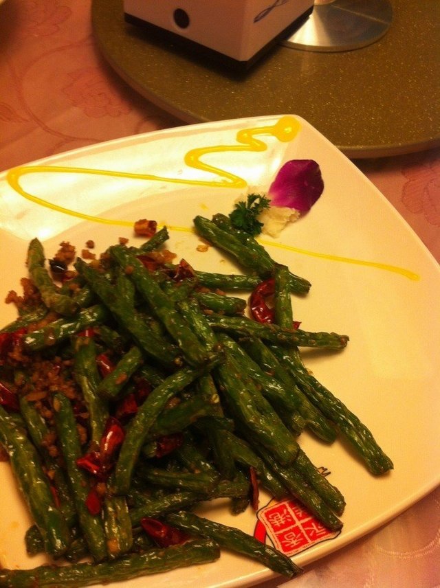 【干煸四季豆】四季豆油拉,吸走了水分,四季豆本身的肉质还是肥厚的,经过干煸之后更加鲜美,咸咸的很脆的口感,蛮清爽的一道菜哟!