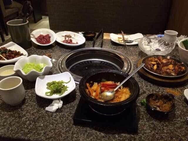 石锅拌饭给的辣酱比较少,好像可以自己去酱料台那么自己添加,烤肉吃的不亦乐乎都懒得去了,反正也比较怕辣的。米饭份量很足啊,太阳蛋的蛋白是熟的蛋黄是液态那种,上面的素菜花样多摆的也整齐好看,味道当然不错的。一份饭我俩合力吃的干干净净。