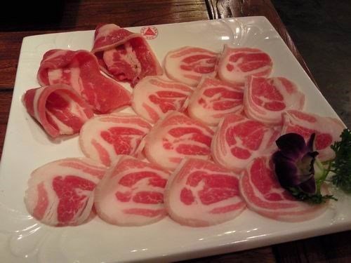 烤五花肉1份,4两,特级肥牛1份,2两,这两个是放在一个盘子里的,五花肉还是不错的,尤其是烤焦一点,吃着很香!肥牛嘛,吃着口感有点硬,不是很喜欢~~~