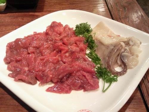牛肉1份,6两,烤鱿鱼1份,2两,这两个是放在一个盘子里的,牛肉很不错,质量很好,量也不少。鱿鱼也还行吧,就是少了点~~~